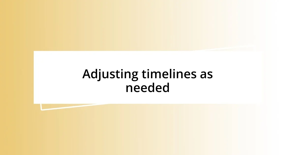 Adjusting timelines is an art that often requires a blend of intuition and foresight. I recall a time while planning a music festival where unexpected weather changes forced me to rethink our setup schedule. It wasn’t just about moving a few tasks around; I had to scramble to communicate these changes to my team while ensuring we stayed on target for the event launch. Have you ever felt that rush of adrenaline when you have to pivot your plans on the fly? It’s both nerve-wracking and exhilarating.