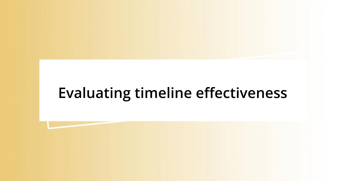 Evaluating the effectiveness of timelines is crucial to ensuring events run smoothly. I’ve often relied on post-event debriefs to assess what went well and what didn’t. For instance, after a tech conference I organized, my team and I analyzed our timeline’s accuracy by comparing planned milestones to where we actually landed. It was eye-opening to see how minor delays could ripple through the entire process. Have you ever taken that step back to understand the root causes of timeline slippages?