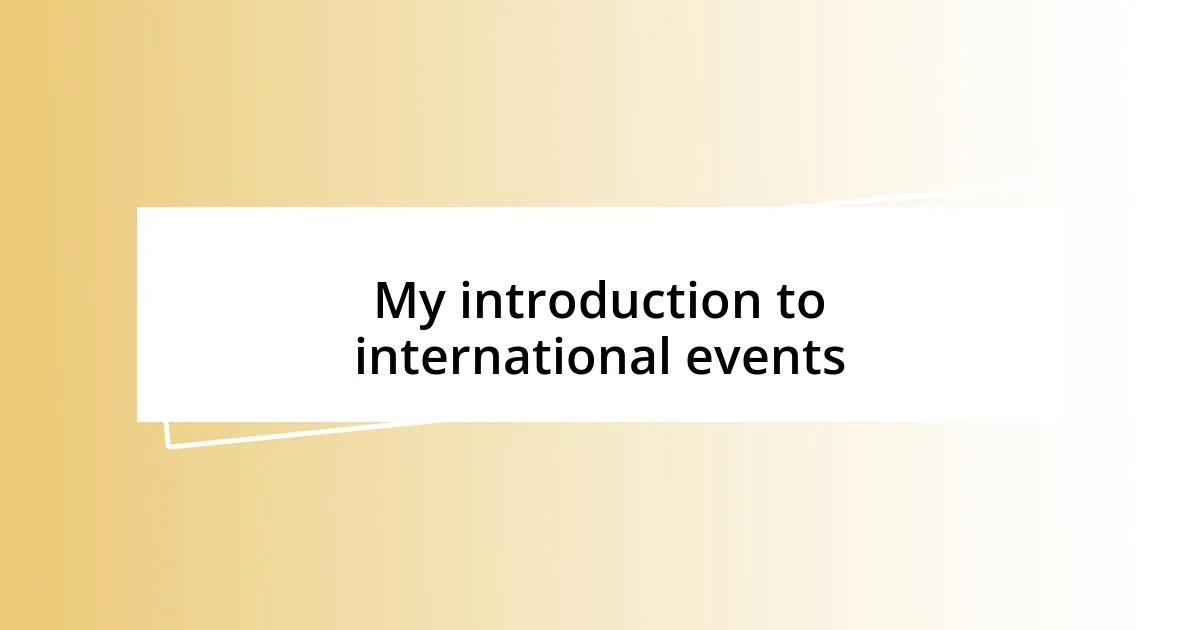 When I first stumbled upon an international event, I was captivated by the vibrant energy that filled the air. It was a world festival showcasing various cultures, and I vividly remember the exhilarating feeling of trying foods I’d never encountered and listening to music that stirred something deep within me. Isn’t it fascinating how a simple gathering can unravel the rich tapestry of our global community?